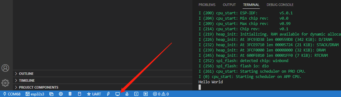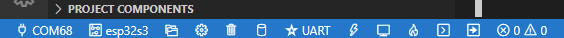 配置好了之后,看一下左下角这些按键,左下角有一堆按钮,其中第一个为选择串口(就是选择你开发板的COM口),第二个是选择版型(ESP32/ESP32-S2/ESP32-S3等等),第三个是打开新的IDF项目,第四个是menuconfig配置,第五个是清除所有缓存(中间文件之类的?),第六个是build整个项目,第七个是选择烧录方式(jtag,串口,dfu),第八个是烧录键,第九个是打开串口监视器,第十个是build并烧录,打开串口监视器,第十一个是打开IDF的终端(如果你习惯了命令的话,可以在这里输入命令执行),第十二个好像是可以自定义按钮?执行自定义任务。